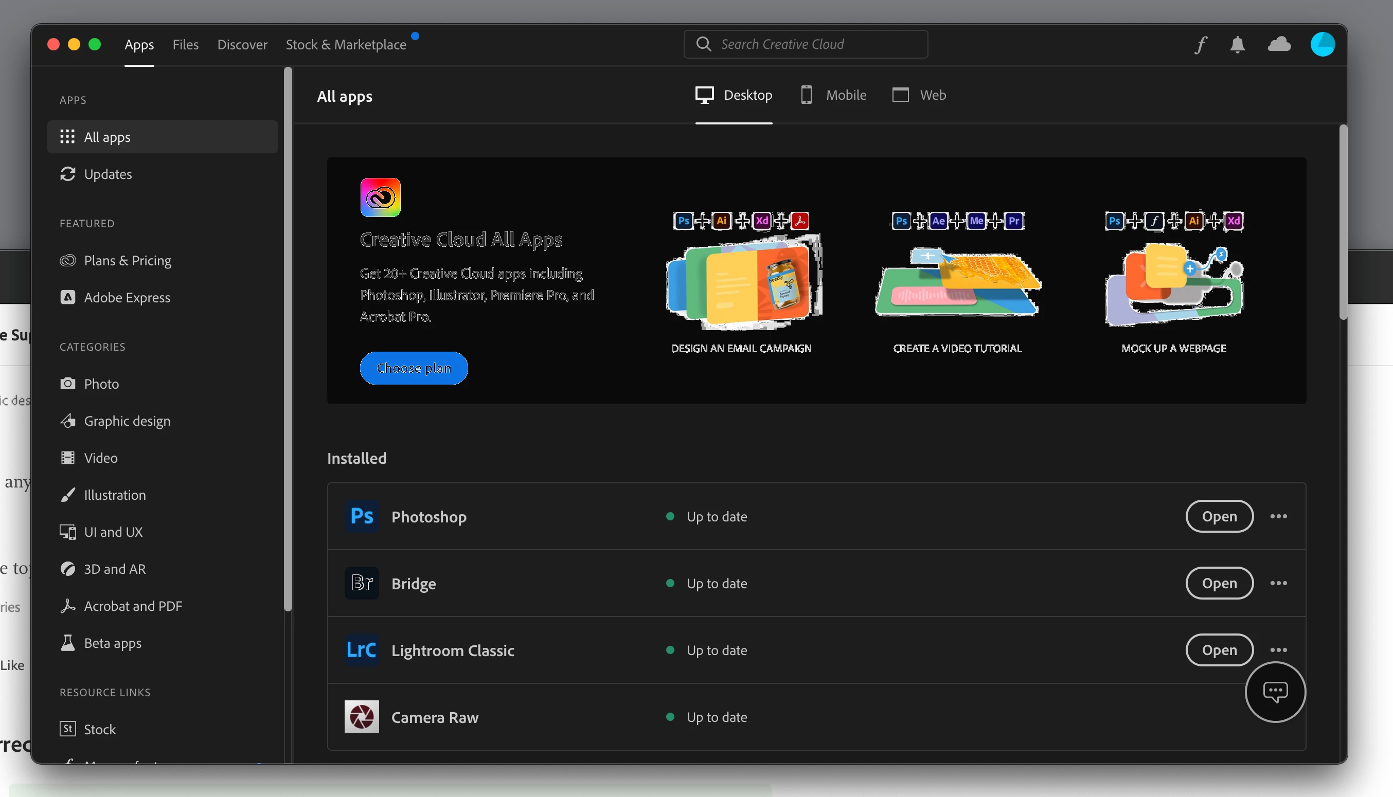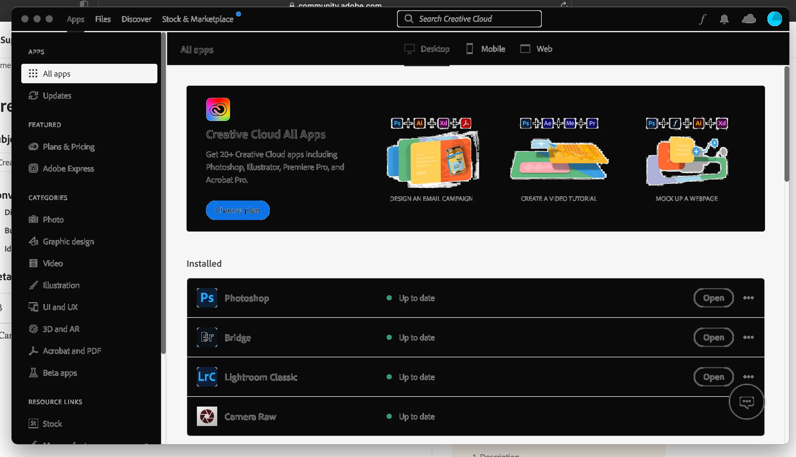 Can someone help me figure out why the creative app looks like this. I just noticed it recently and I have uninstalled and reinstalled the creative cloud app. I have not done a fresh install of everything, becasue I do not want to loose some of my settingings in photoshop or lightroom. I have tested my GPU and CPU and they seem to be fine. I have a 2019 iMac Retina 5K i9 with a Radeon Pro Vega 48 video card. I have 128GB of RAM too.