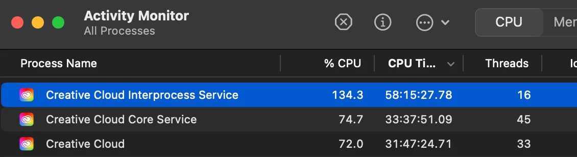 Hi. I have a MacBook Pro running Sonoma and bout a week ago, I started having an issue with high CPU usage from the Creative Cloud Core Service. It is running at around 100% of my CPU when I check it on activity monitor. Doesn't matter if I'm running an application or not. I've tried restarting, quitting the process, and reinstalling CC.