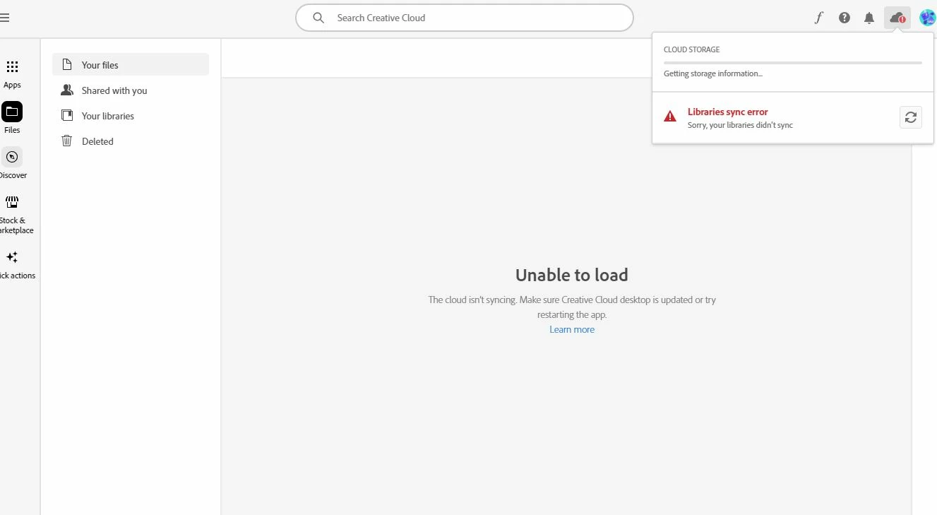 hi, i have a problem with the Adobe Creative Cloud desktop app, it can't count the cloud storage amount and shows ((getting storage information ...) for a long time and it doesn't change, also sometimes the ((libraries sync error )) occurs, also I don't have access to ((your files)) and ((shared with you)), also the fresco doesn't work and also the AI options don't work in photoshop and illustrator what's the problem? thank you