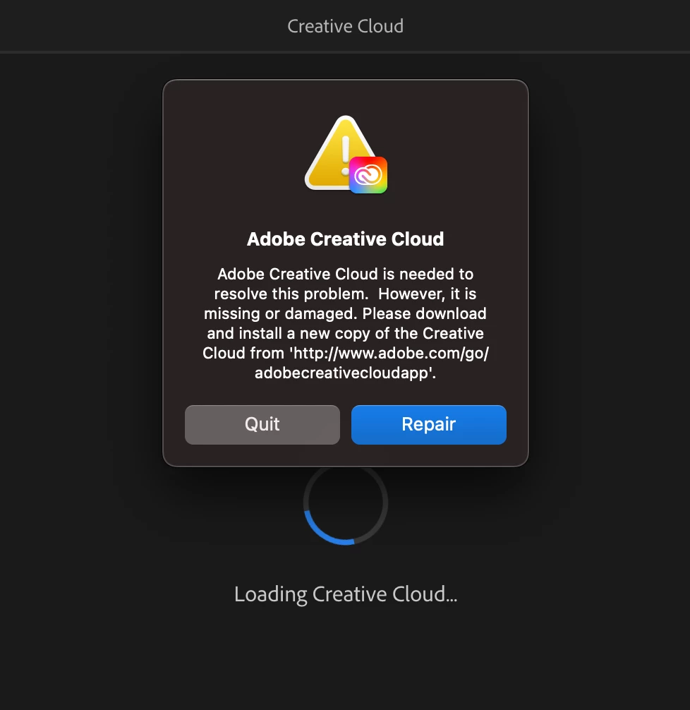 I have a 2023 MacBook Pro M2, OS 13.3.1 (a). When I try to launch the Creative Cloud desktop app, the wheel spins for about 5 minutes, then comes to a Repair screen: