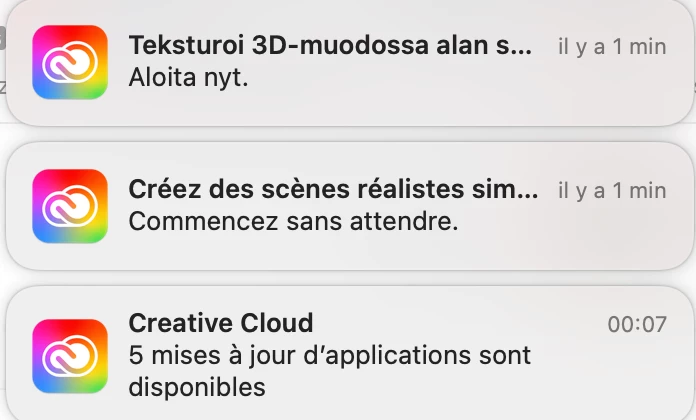 I'm having a strange problem that I can't really figure out. I know Creative Cloud sends notifications on mac to invite us to try out Substance 3D. Recently however, some of those notifications come in both my defined language (french) and what I figured out was finnish.