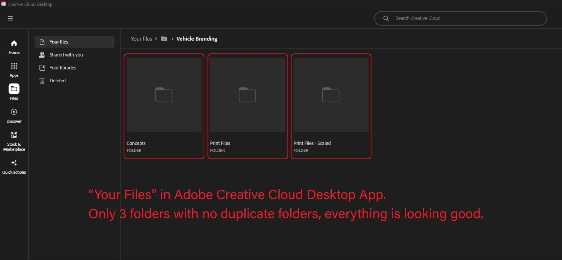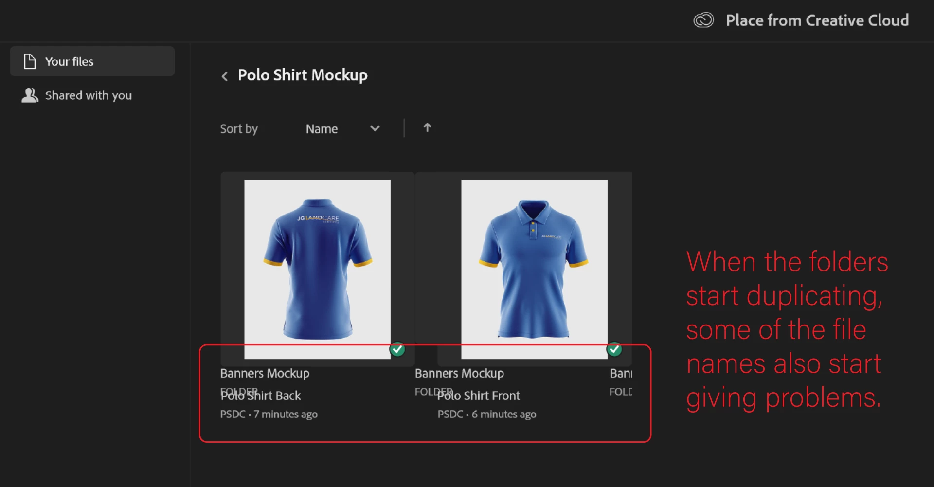 I have been struggling with a bug that shows duplicate folders when saving a project to Adobe Creative Cloud. However, everything looks normal if you go to the exact location in "Your Files".