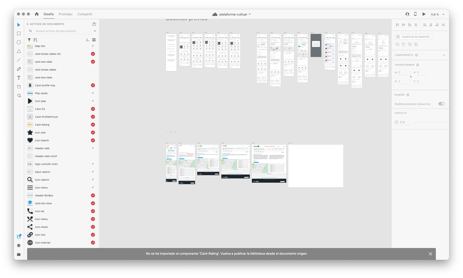 Hemos creado una biblioteca design system que está vinculada a un archivo. De repente los componenetes han dejado de vincularse bien. Seleccionamos alguno de los componentes que está dando error para reenlazarlo a la biblioteca y tal como me dice en el mensaje vuelvo a vincular la biblioteca. Una vez que lo hago me sale un mensaje que me dice que vuelva a publicar la biblioteca desde documento origen. Después de publicarla de nuevo lor errores no se resuelven. Adjunto imágenes.