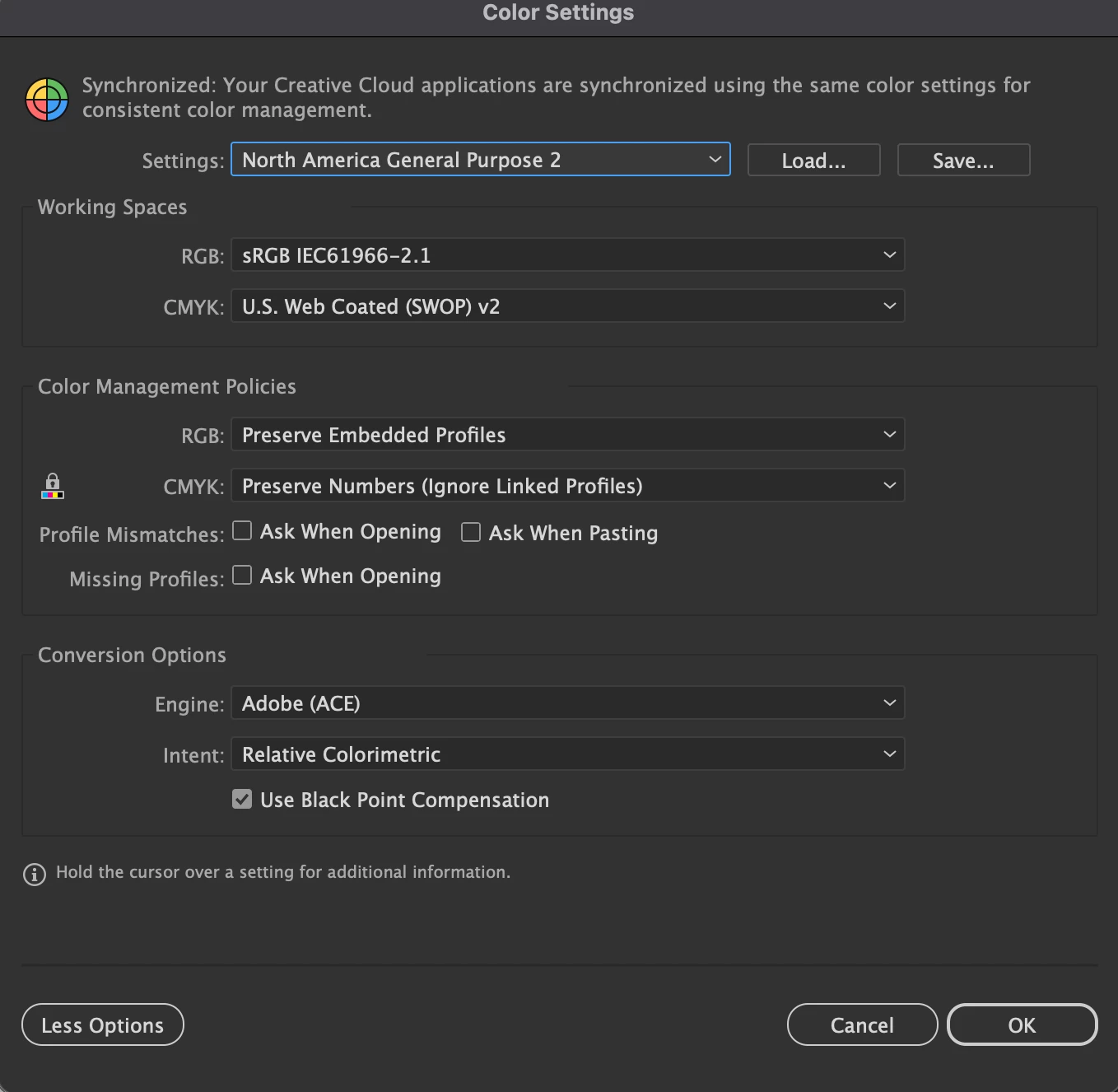 Switching to CPU preview mode is the only way to see accurate colors in Illustrator for Mac. The colors look dull when GPU Performance is enabled. I know it’s not a hardware issue, because the colors on my Mac screen look fine, even when I drag the window over to the external monitor. It’s when I release the window to the external monitor that the colors in GPU Performance become incorrect. The attached images are screenshots taken from the external monitor with CPU mode and GPU mode. I have updated my Mac to the latest software, so I also know that’s not the issue. The monitor has been color calibrated to match the Mac. My color settings in Illustrator are also attached.