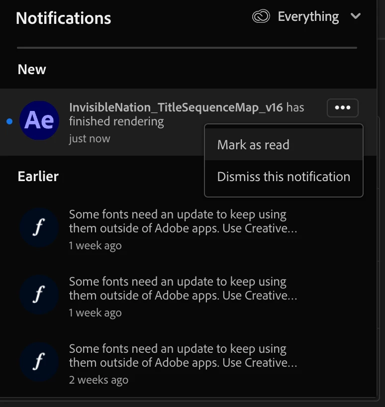 2b: on notifications about a render finishing in AE, when I do dismiss them, the notifications each pop up on my mobile device AGAIN instead of just going away quietly.