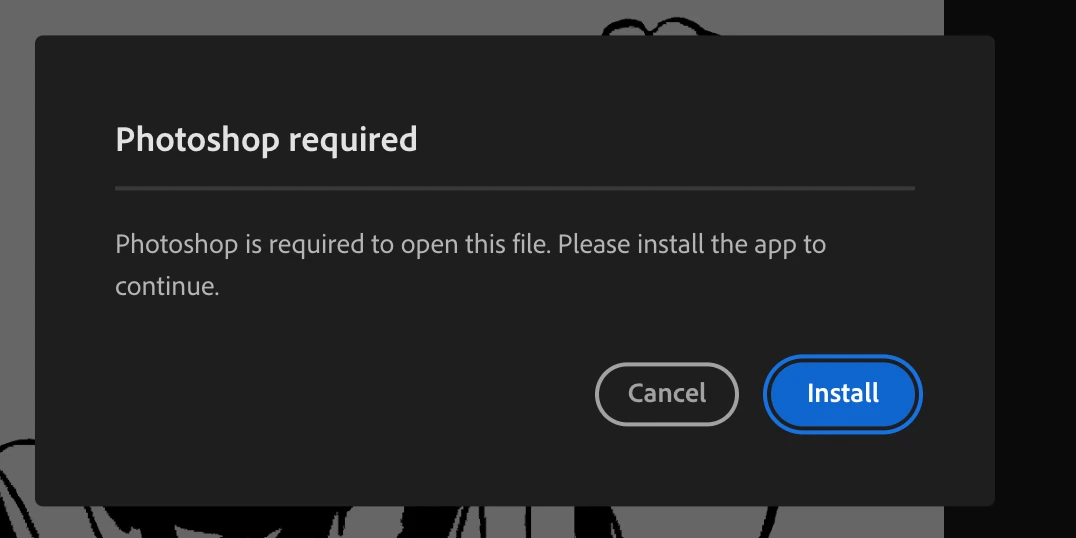 Error Message: "Must install photoshop" And prompts you to install it, and starts the download quickly.