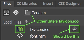 When viewing the Local Files list in DW, the favicon.ico file previews the icon to the left of the file name. This preview/icon is often from a previously opened Site, and not the current Site. It is as if the icon cache was not updated, and showing from a previous session. This has been happening for 5 years at least. Closing DW with the current Site selected, then reopening seems to load the correct icon.
