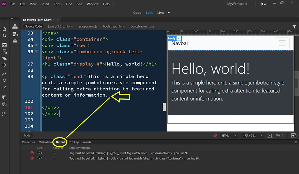 At the bottom right of DW there is a little green tick icon with the tag 'No errors'.