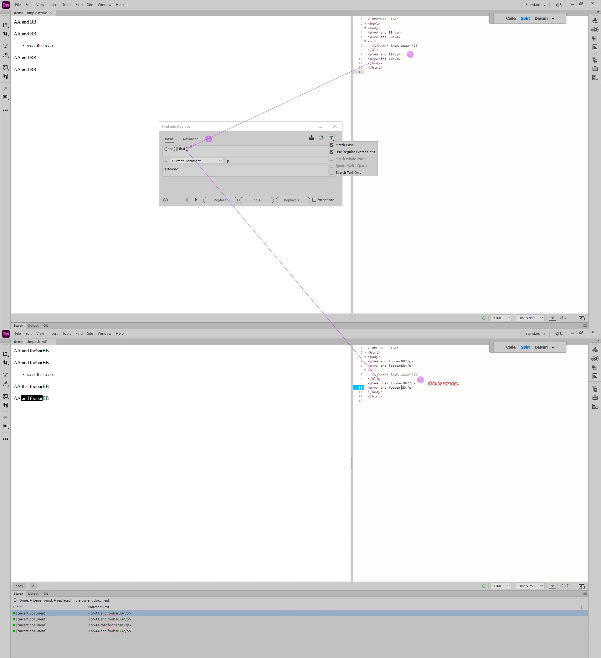Why does Dreamweaver regex replace some word into a wrong word?