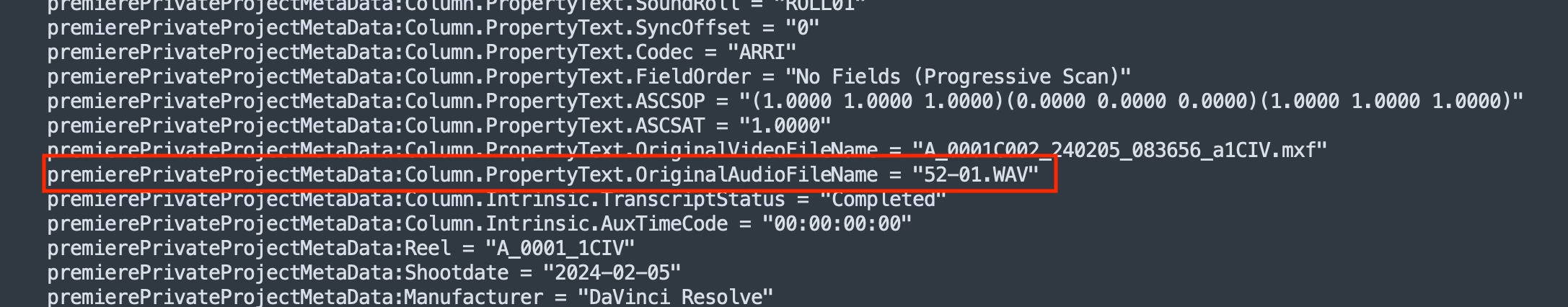 Also, when I use dumpObject() I can see the Column.PropertyText.OriginalAudioFileName property, but premiere isn't reading it correctly, and will display incorrect data. See screen grabs and txt file attached.