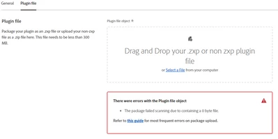 I have a ZXP plugin that has been maintained for 2 years and has released many versions before without problems. Recently updated a version, on the new publishing site (https://developer.adobe.com/distribute/) to submit, the result could not upload the file, as shown below.