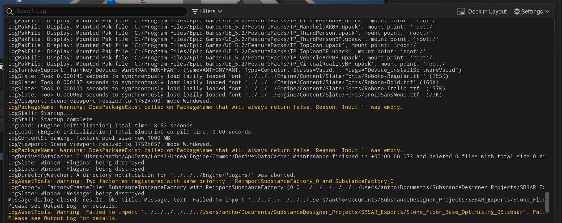 When I try to use the plug in "substance 3d for unreal engine" in UE5.3.1 and 5.2.1 to import a sbsar file it shows this error and does not show up in the folder: