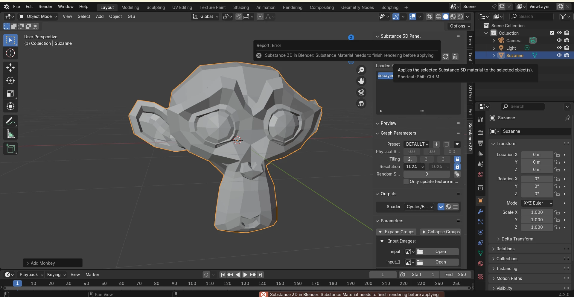 Currently using blender 4.2 and aslo tested the pluggin on blender 4.0 but either version gives the same result, working on an HP Pavillion laptop running windows 11, the plugin is version2.1.1. The sbsar material will load in with all the correct exposed parameters but when clicking apply it always says the material must be rendered first but never does