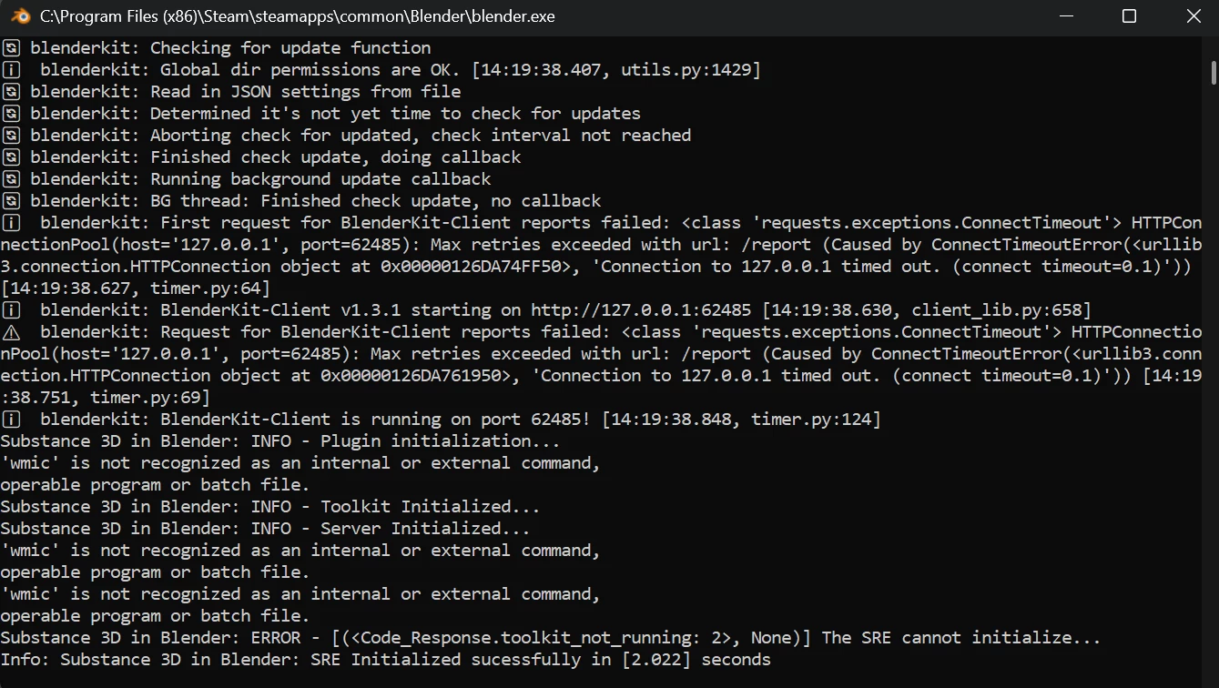 Substance 3D in Blender: ERROR - [(<Code_Response.toolkit_not_running: 2>, None)] The SRE cannot ini