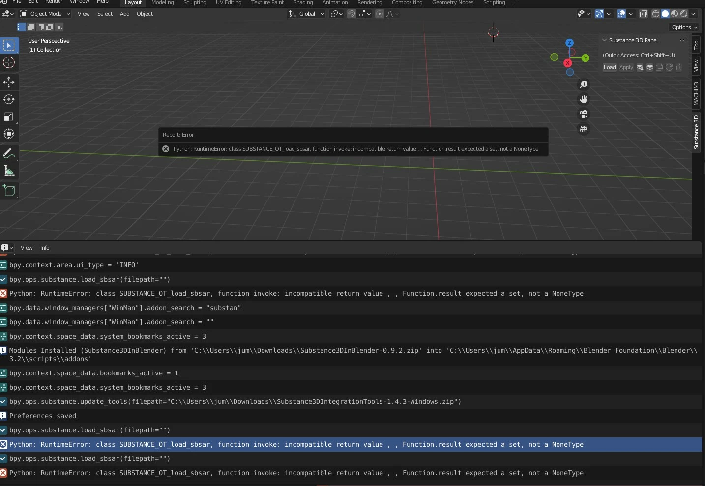 Even after reinstalling blender (3.2.2) , substance 3d addon (0.9.2), and integration tools (1.4.3) I am getting an error when trying to load a material.