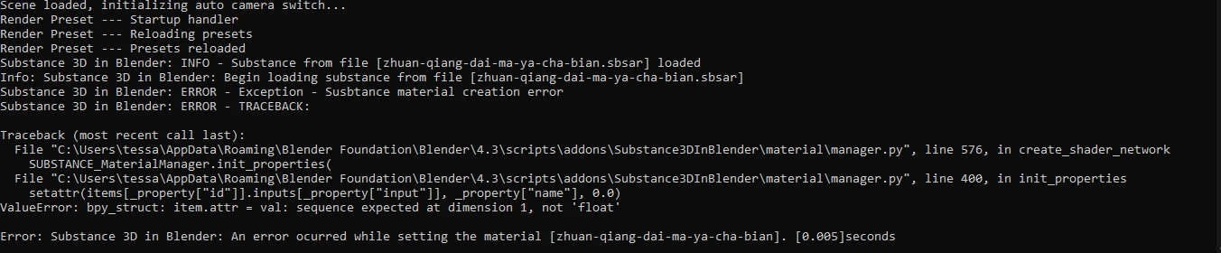 Unable to load SBSAR materials into Blender. The console error log is attached.