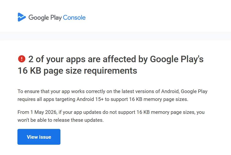 From 31 May 2026, if your app updates do not support 16 KB memory page sizes, you won't be able to release these updates.