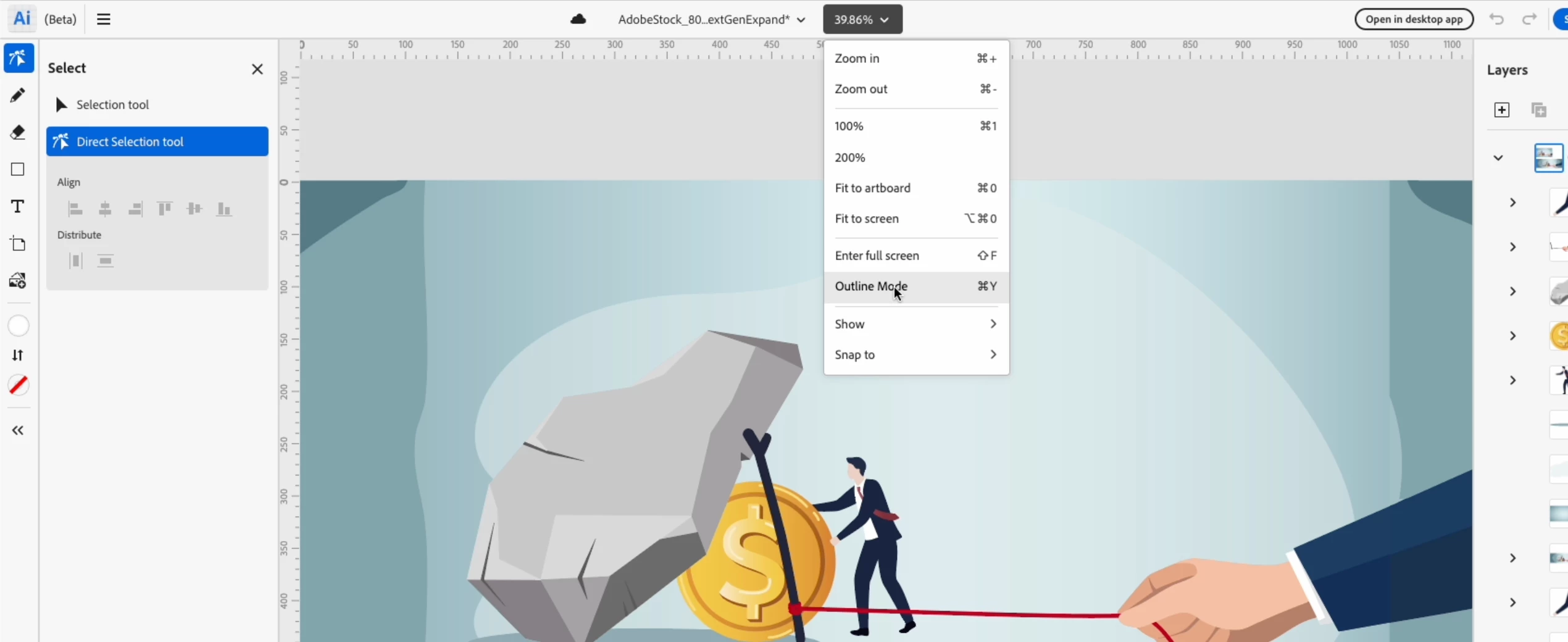 In illustrator online, the workspace not all your changes are showing up on there. It is showing me an outlined version of my project. You can not show any color changes or making any lines thicker or thinner. It is a guessing game on how it is going to show up when you export it. Was excited to have this feature as I am noy currently have access to my main computer with this program and wanted to work on a fun little project. I have given up on it and will wait till I am back with my main computer to do anything with it.