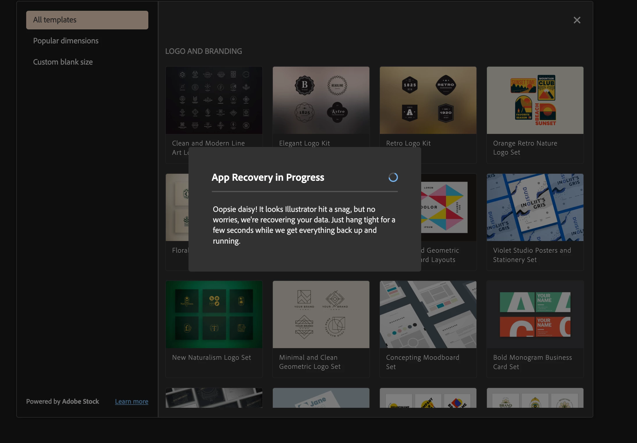 some of the templates fail to open, generating a "App Recovery in Progress" notification that never goes away.