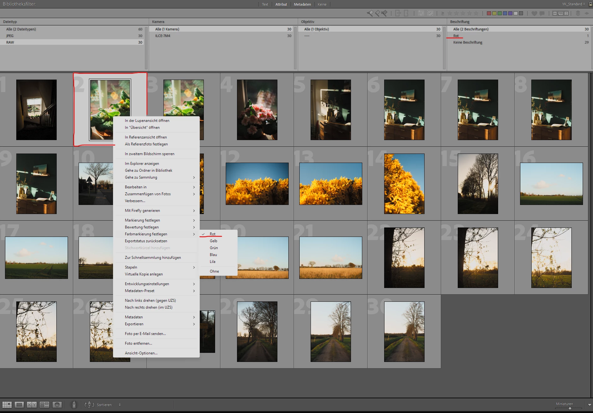 - When I have the filter panel expanded in grid view, I can see that applying a color label does indeed give the image the color label as it shows up in the “label filter” and also when right clicking the image.