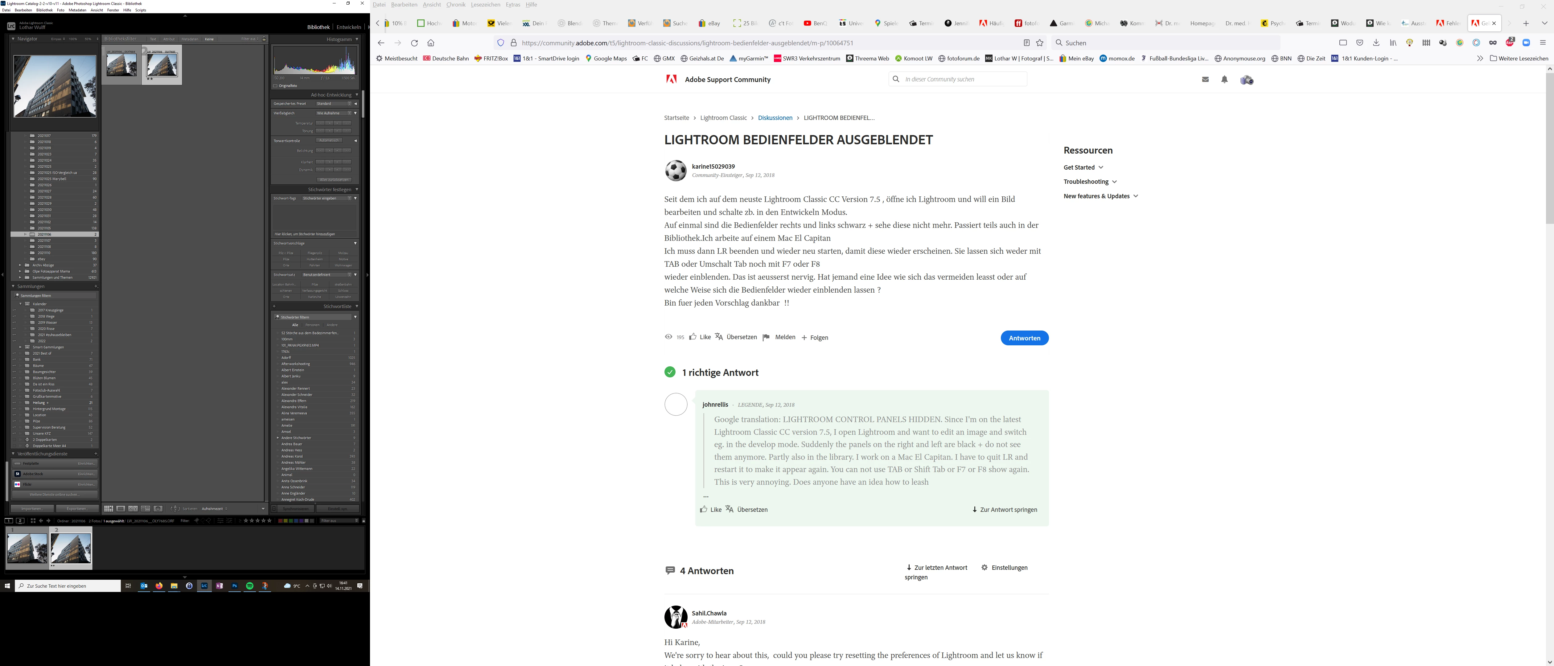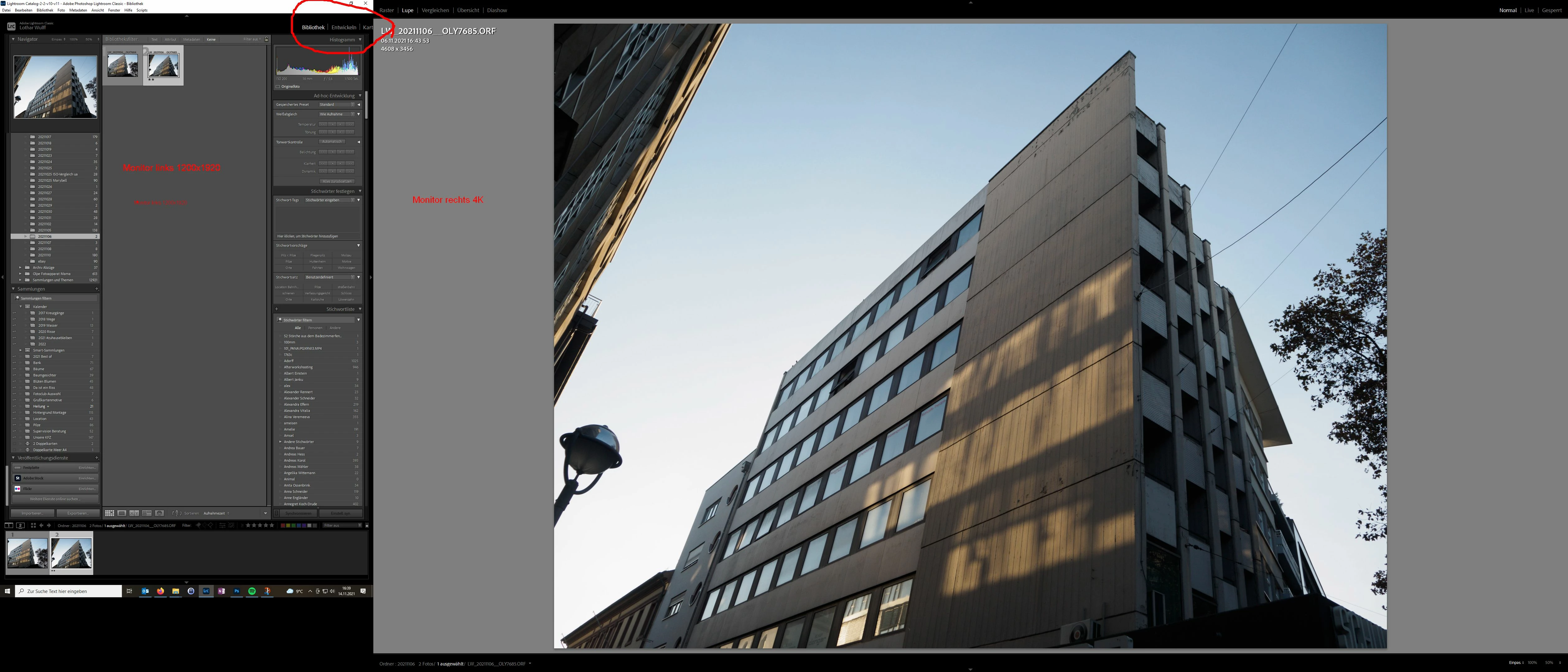 Das Fenster ist bildschirmfüllend. (1200x1920px). vor dem Update passte es, hat sich das mit der Fenstergröße zusammengeschoben. In der Mitte ist ja Platz genug. Auf dem Screenshot ist rechts der zweite Bildschirm zu sehen, da kann ich nicht reinziehen (unterschiedliche Auflösung, und dann ist eben Bildschirm 2 in LR nicht mehr zu sehen).