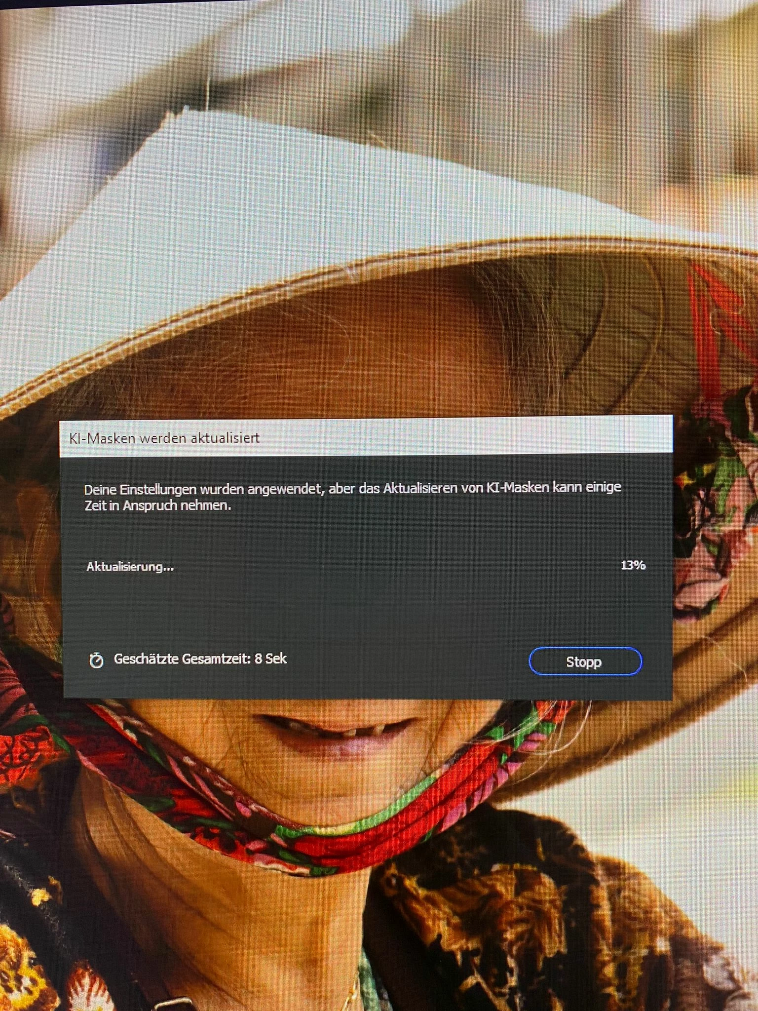 One sample screenshot (German). It says 8 seconds, but nothing happens. Even if it works the first time, just apply another presets and performance goes down until the application itself stops working. Seems like an architectureal flaw, not a superficial, minor error.