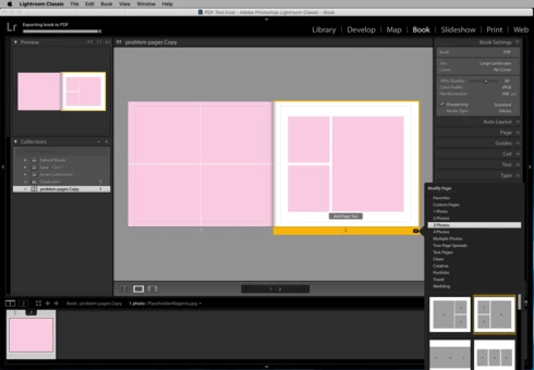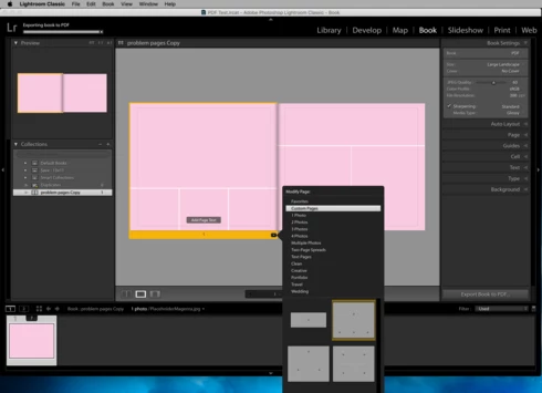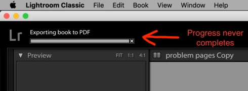 Trying to export a book to PDF. 13x11 size, no cover. PDF will be created with most pages, but pages using specific custom pages are skipped/left blank. In LR, the progress bar still says "exporting book to PDF," and that process is never completed.