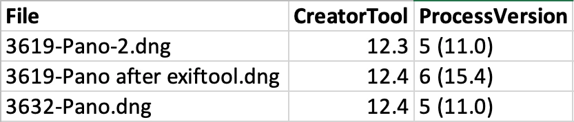 Note that 3632-Pano.dng has Process Version 5, even though it was created by LR 12.4.  That appears to be because the first input file 3632.DNG is Process Version 5, while the second and third input files are Process Version 6 (not sure how that might have come about).