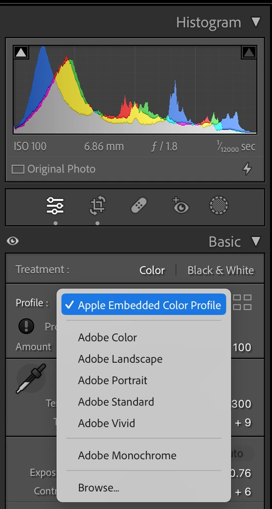 I tried syncing the profile setting from the iOS captured image to the Lightroom captured one and this doesn't work - it does not receive the Apple ProRaw or Embedded Color Profile option.
