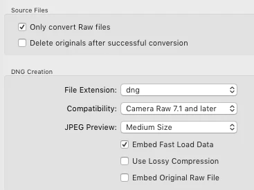 5. Select both raws and do Library > Convert Photos To DNG with these options: