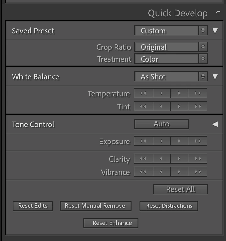 1. Open a photo in Develop and click Reset.