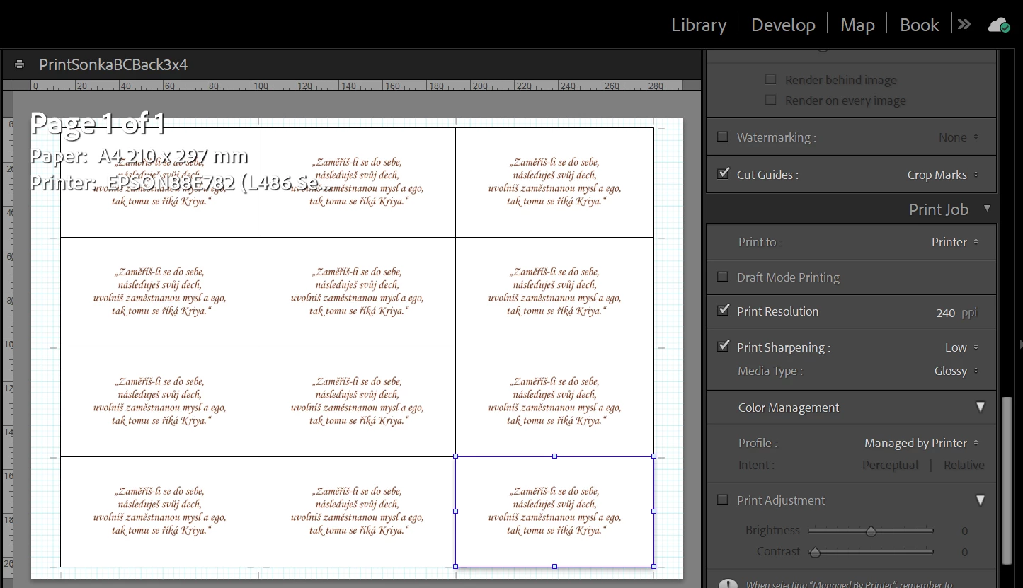 I'm using LRC's print module with a layout of 12 cells at one A4 sheet. All cells contain the same image.