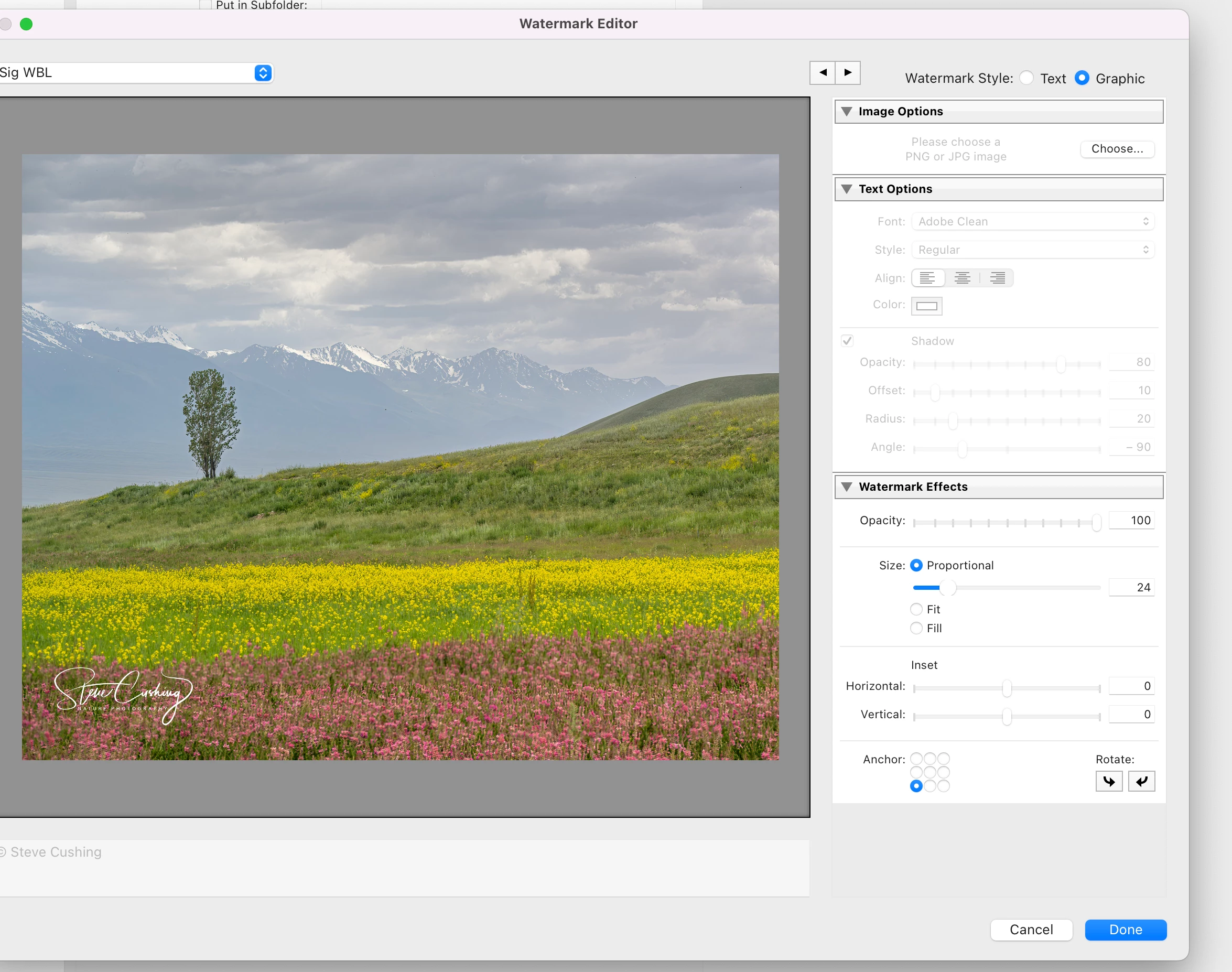 I have been using a PNG image of my signature for many years on exportin g photos. I have not changed any settings and am exporting as JPEG. Suddenly the signature, although showing in "edit watermark" is not showing on the exported image. I have edited watermark, loaded the graphic and renamed the preset but to no avail. Any thoughts will be appreiciated.