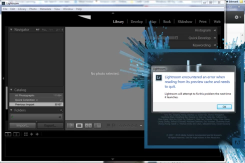 Every time I open lightroom 5.6 64 bit, I get an error message that states, "Lightroom encountered an eror when reading from its preview cache and needs to quit. Lightroom will attempt to fix this problem the next time it launches." I cannot work on anything! Any suggestions????