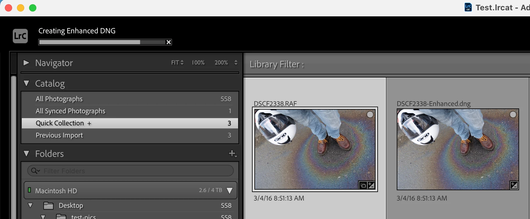 Photo > Enhance with the Super Resolution and Create Stack options never completes when run on a photo in Quick Collection. The .dng appears but the progress bar never finishes. This doesn't happen when Create Stack is unchecked. Resetting preferences doesn't help.