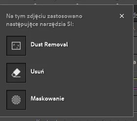W tym oknie jest błąd w tłumaczeniu na język polski. Powinno pisać “Usuwanie kurzu” a nie Dust Removal