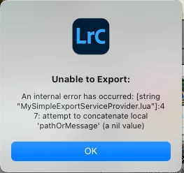 - Change line 47 of MySimpleExportServiceProvider.lua to be: