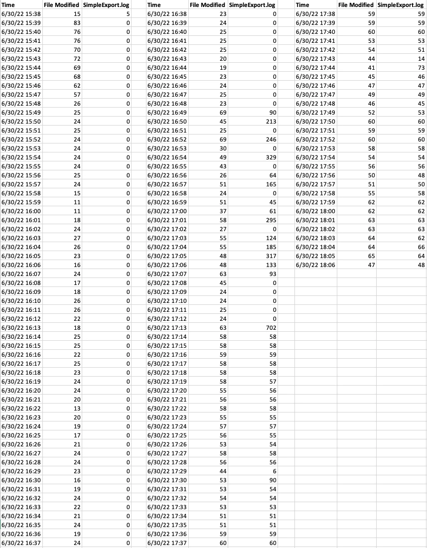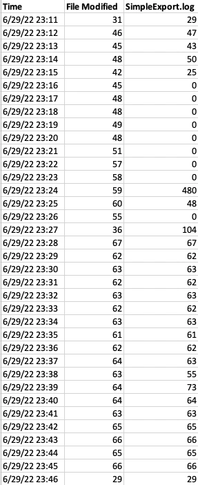 This table shows the rates by minute at which the exported files were written to disk (the File Modified column) and at which they were handed to the plugin (the SimpleExport.log column):