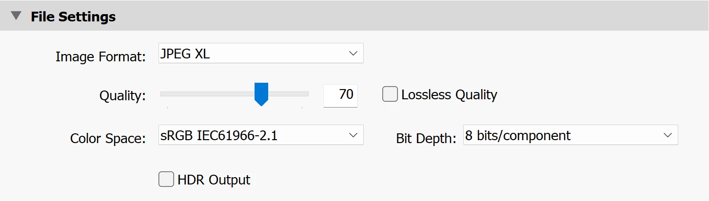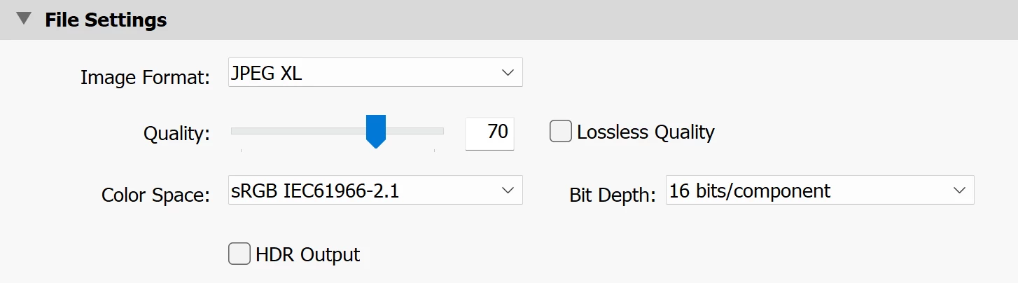 3. In File Settings, set Image Format to JPEG XL and Bit Depth to 16 bits: