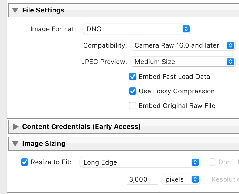 2. Do File > Export, with the the File Settings options Image Format: DNG and Use Lossy Compression, and the Image Sizing option Resize To Fit: Long Edge, 3000 pixels: