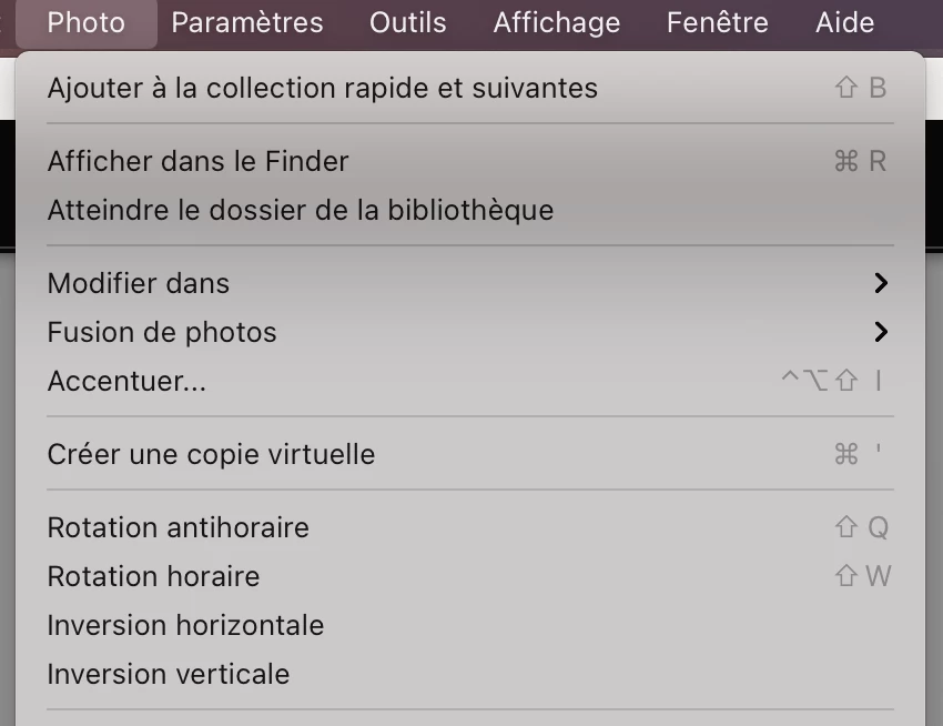 P: (French) Shift + Q command is no longer for image rotation but still in the Menu
