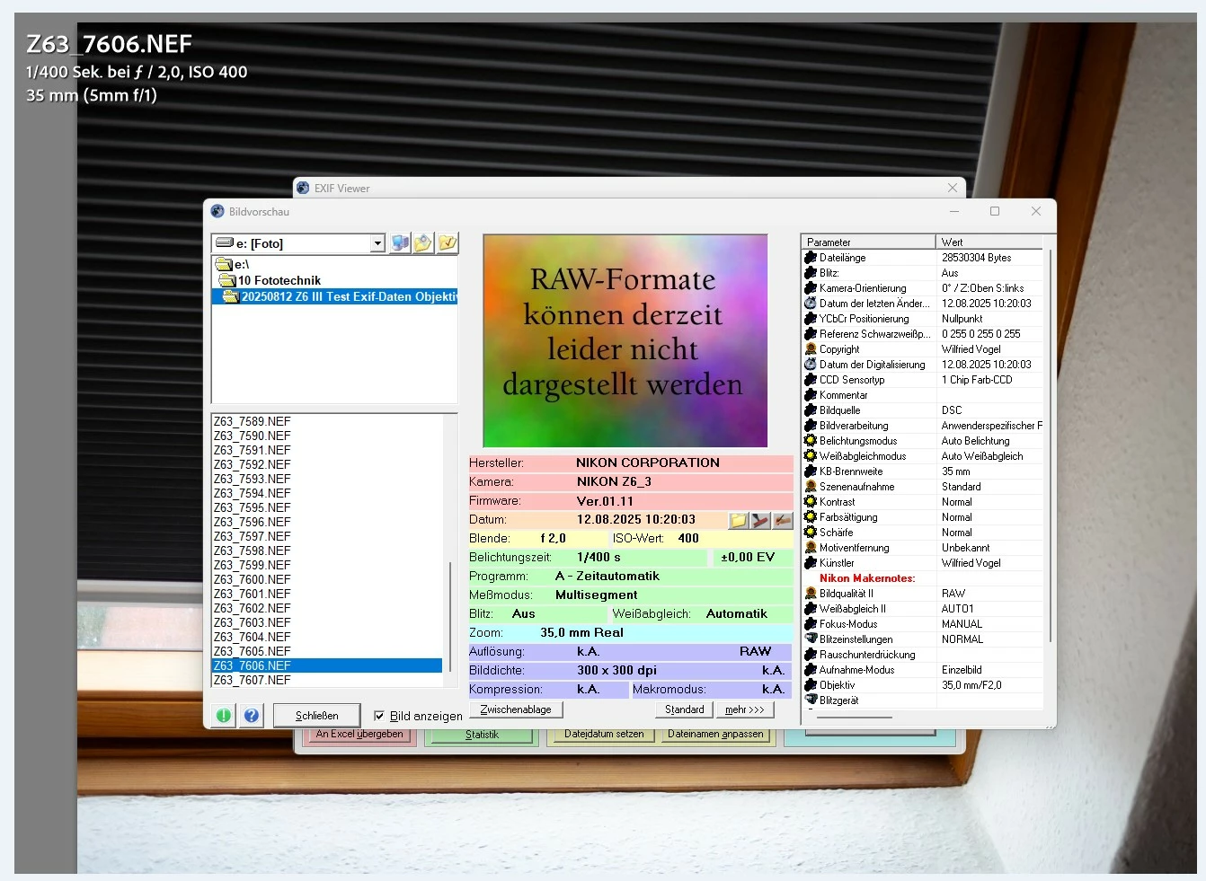 In den RAW-Aufnahmen mit beiden Kameras werden im Exif-Viewer die korrekten Objektivdaten angezeigt!