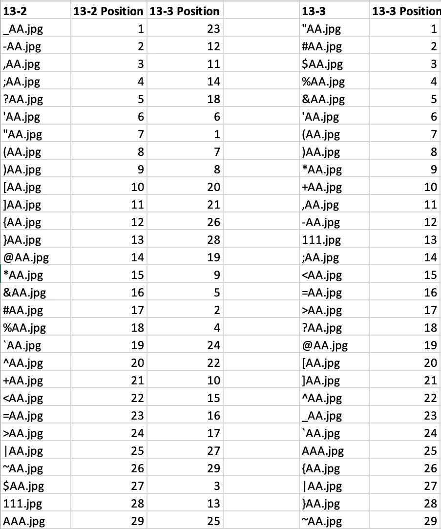 This table shows the ordering of the file names in LR 13.2 compared to LR 13.3: