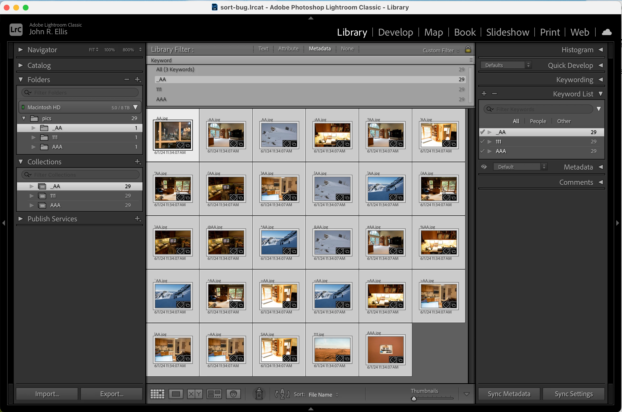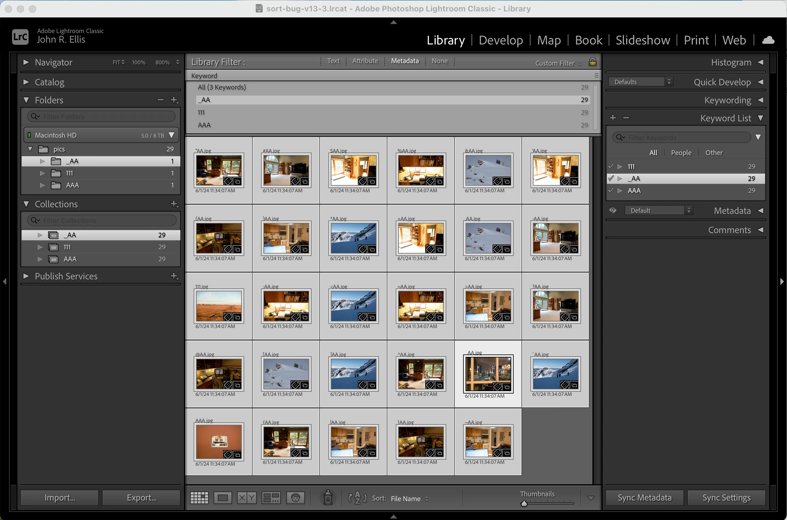 1. Download and unzip this tiny catalog folder, which contains the LR 13.2 catalog "sort-bug.lrcat" and the upgraded version "sort-bug-v13-3.lrcat":