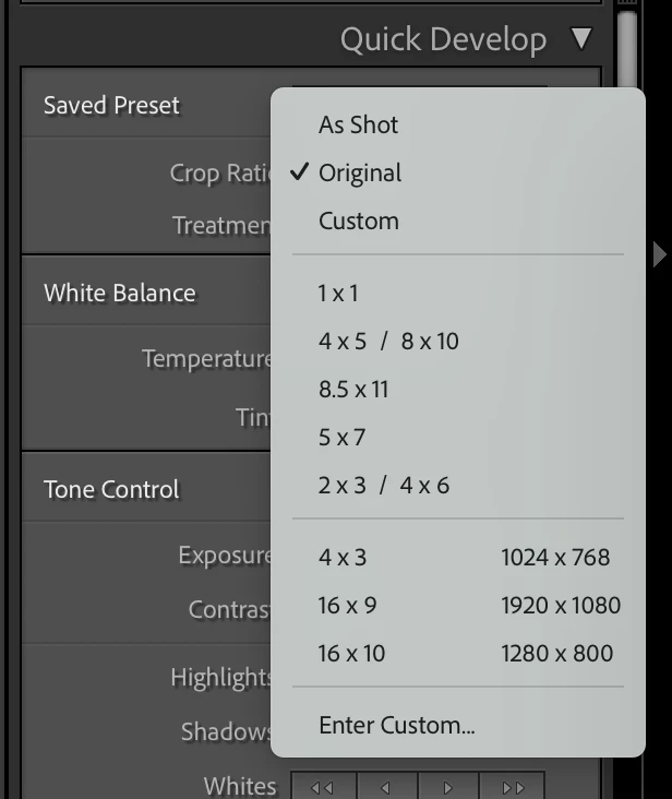 I have a collection of photos, some are originals with a 2x3 ratio, and some derivatives with a 1x1 ratio. I am trying to reset the crop on all of them to "Original", both by selecting "Original" and hitting "Reset".
