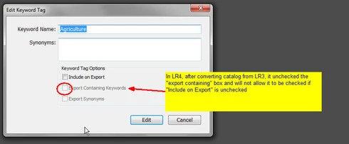 In LR4 all my LR3 keywords that had this pattern were changed during catalog conversion and I can no longer set this pattern. Turning off "Include on Export" now turns off "Export Containing" and "Export Synonyms" rather than leaving them alone as in LR3.