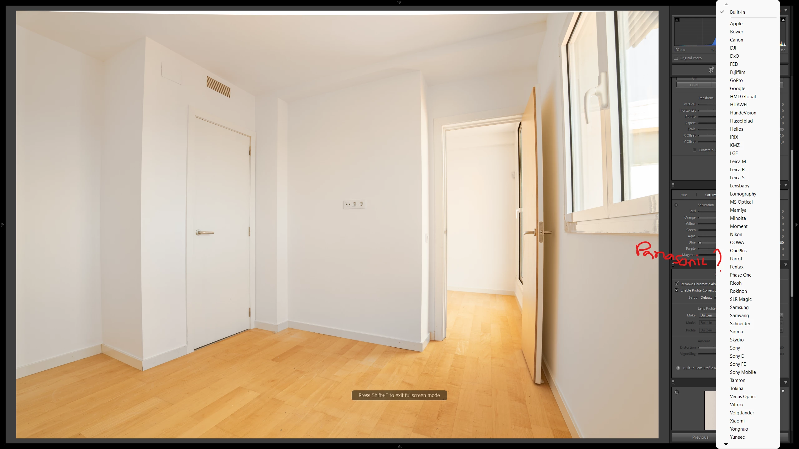 The first screen capture shows the Panasonic profile (and indicates “Camera settings”) did that get applied automatically? Did you export the raw image as a DNG after the lens profile was applied?