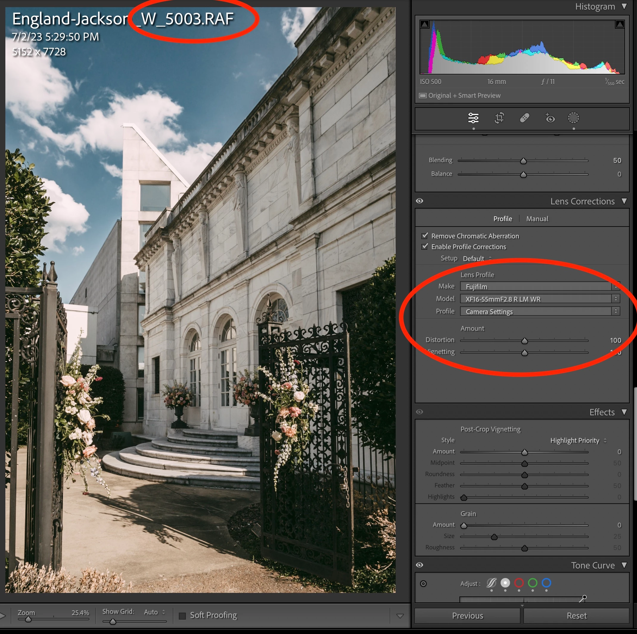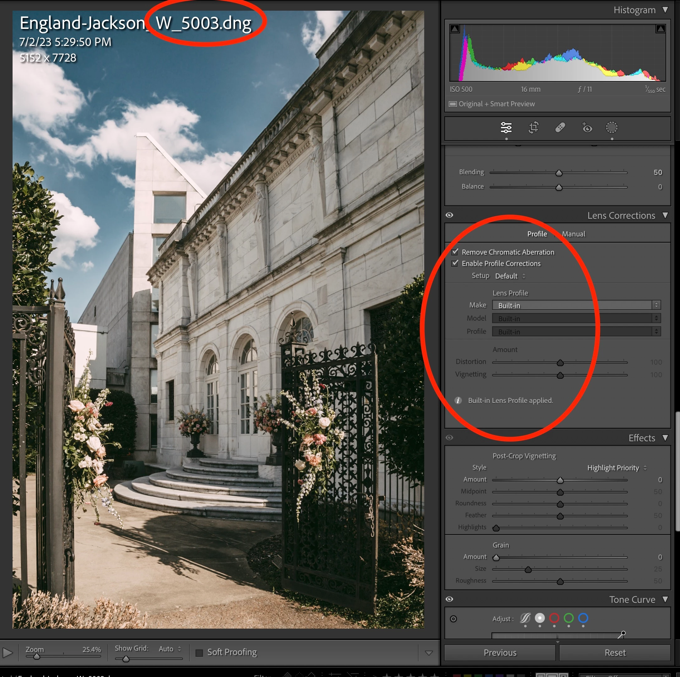 Note that LR is showing "Built-in Lens Profile applied," even though it clearly has not (look at the curvature of the fence posts). As often as not, LR will show "Unable to load lens profile."