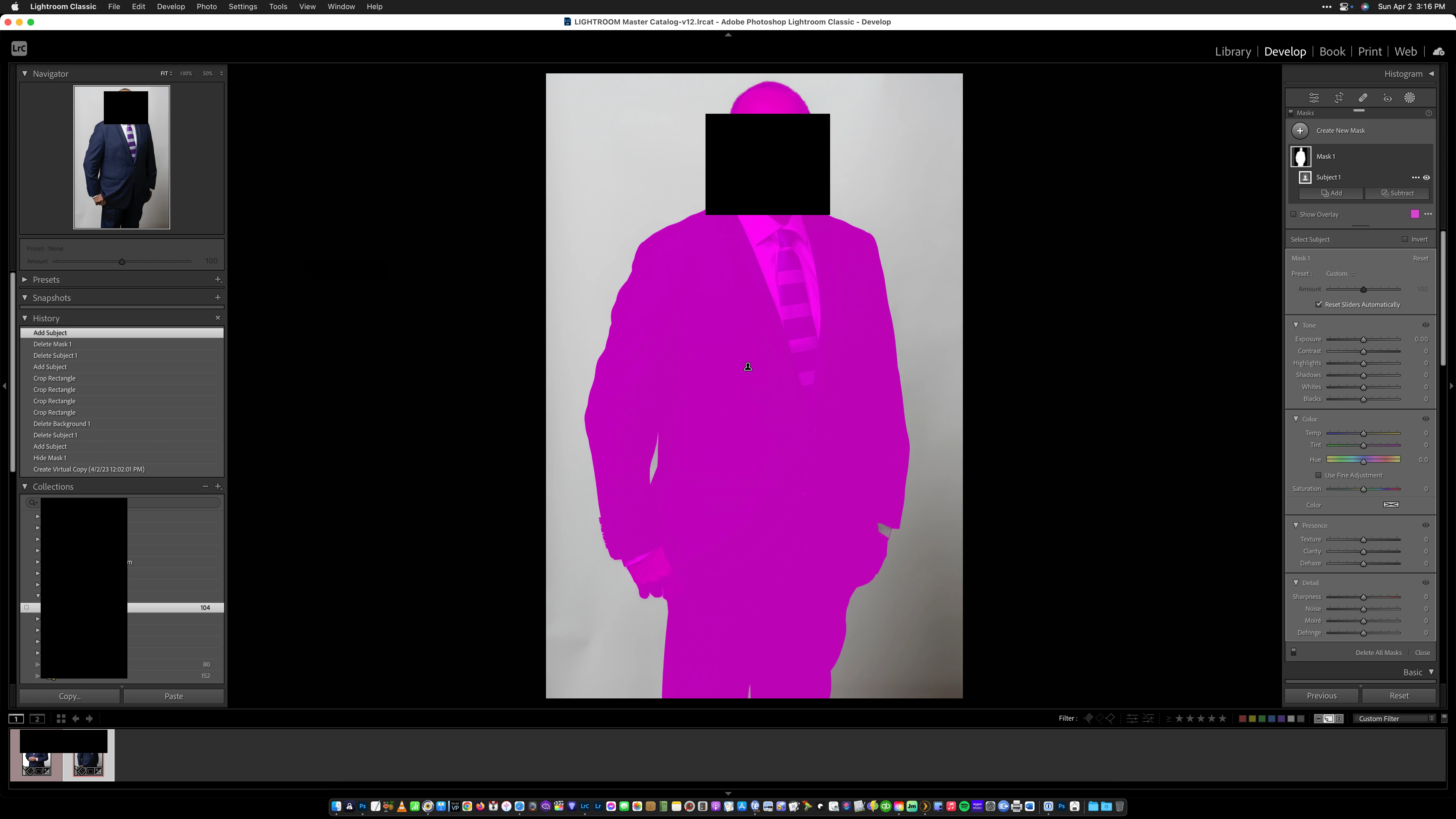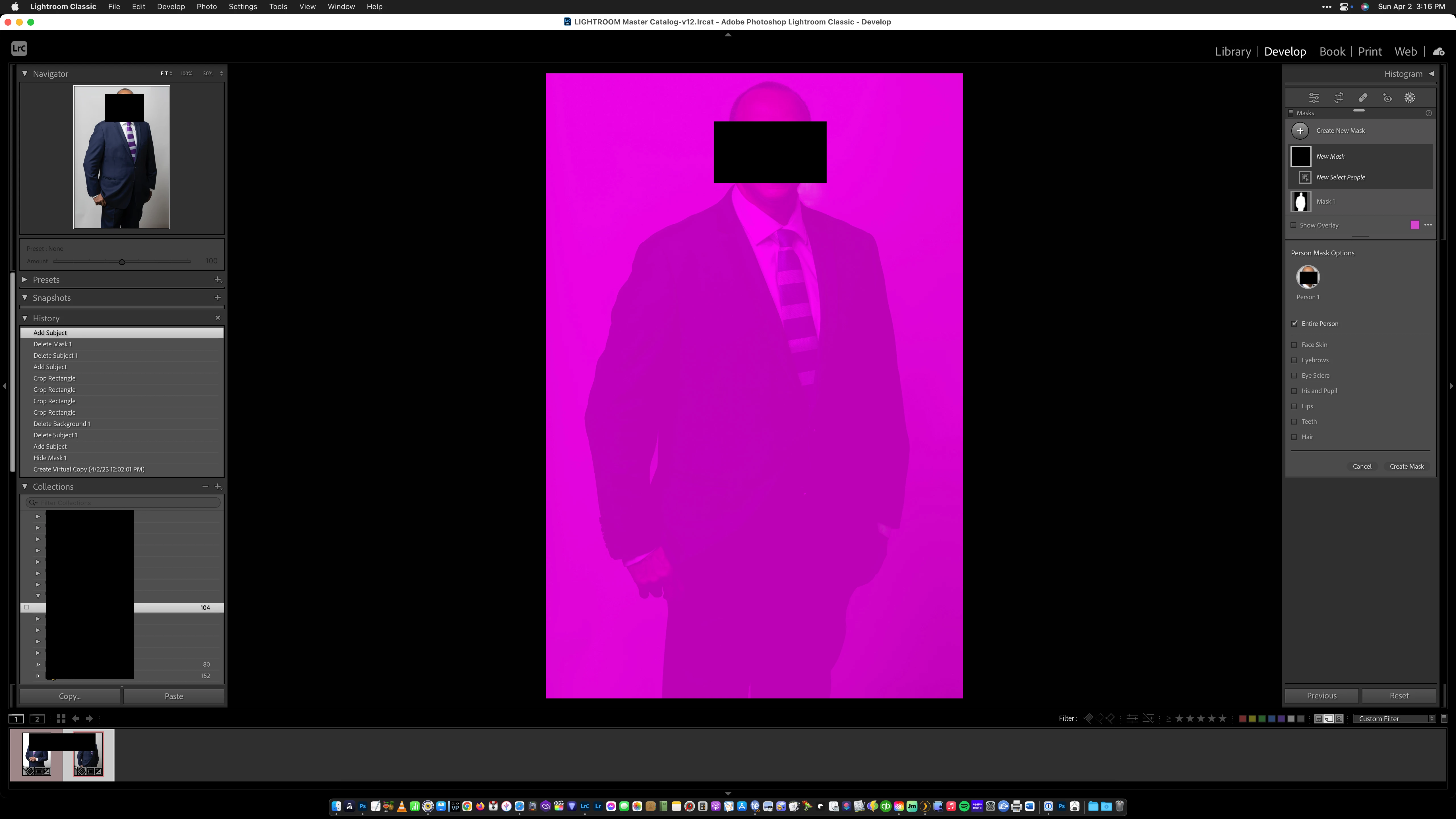 I've attached two (redacted for privacy) screenshots of the "Subject" masking that still works as it should and the "Entire Person" mask that shows where the entire photo area has been selected incorrectly by the AI.