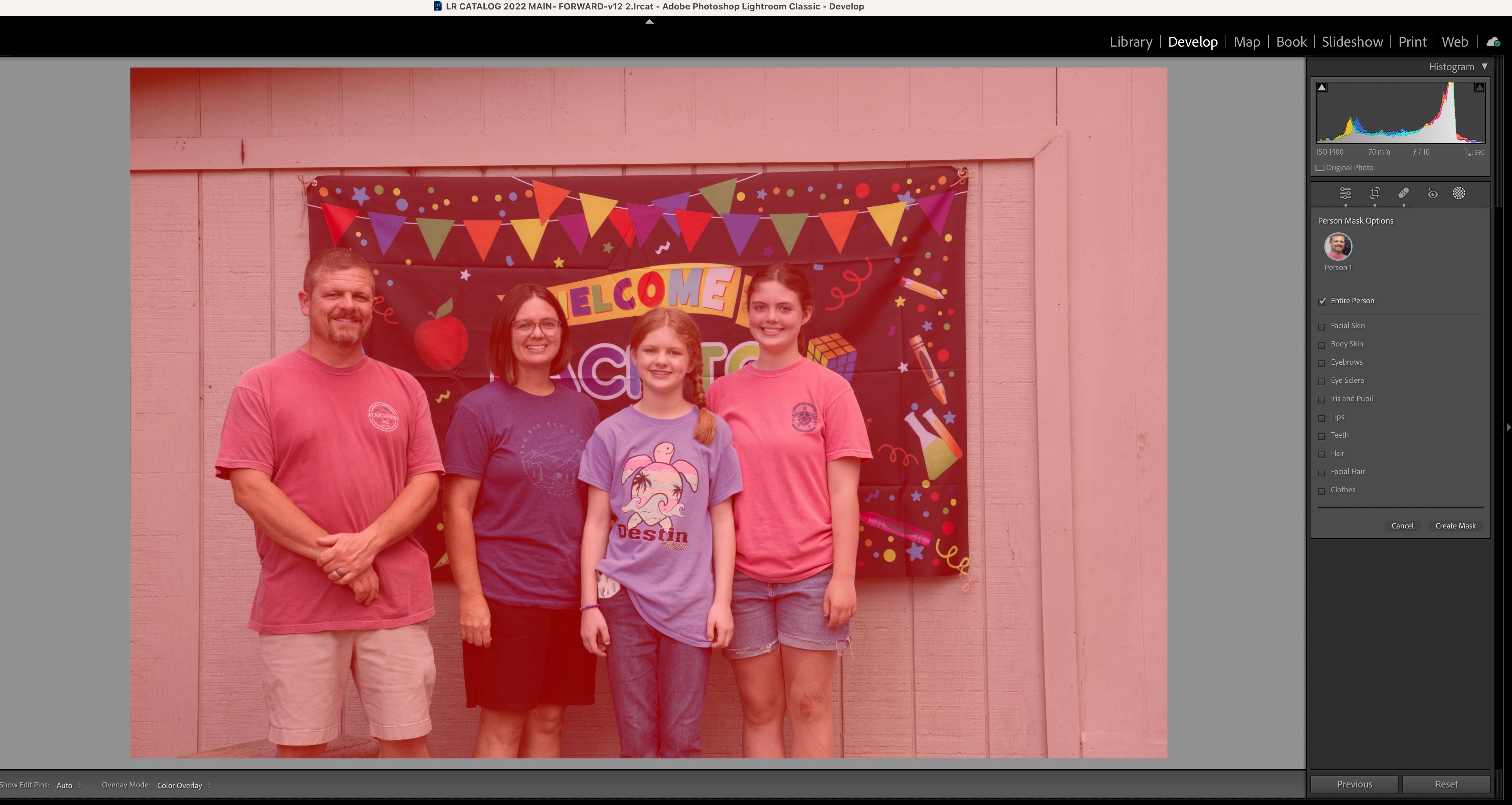I am getting the entire image selected when I try to use the "Select People" then choosing "Entire Person." Lightroom Classic allows me to individually select the hair, teeth, eyes, etc. as usual but when trying to select the entire body, the whole screen gets turned pink to indicate that the Lightroom thinks that the whole picture is the person.